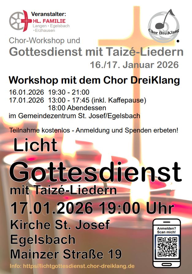Es ist geplant, am Freitag den 16.01. und Samstag den 17.01.2026 wieder einen Workshop mit Taizé-Liedern anzubieten.